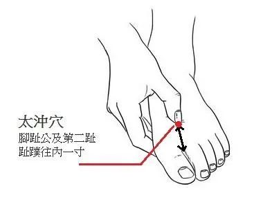 2、點肝穴:點揉太沖穴,太沖穴位于足背大腳趾和第二趾結合的地方向后,在腳背最高點前的凹陷處。在春季每天按揉五分鐘可以起到很好的疏肝理氣的作用。