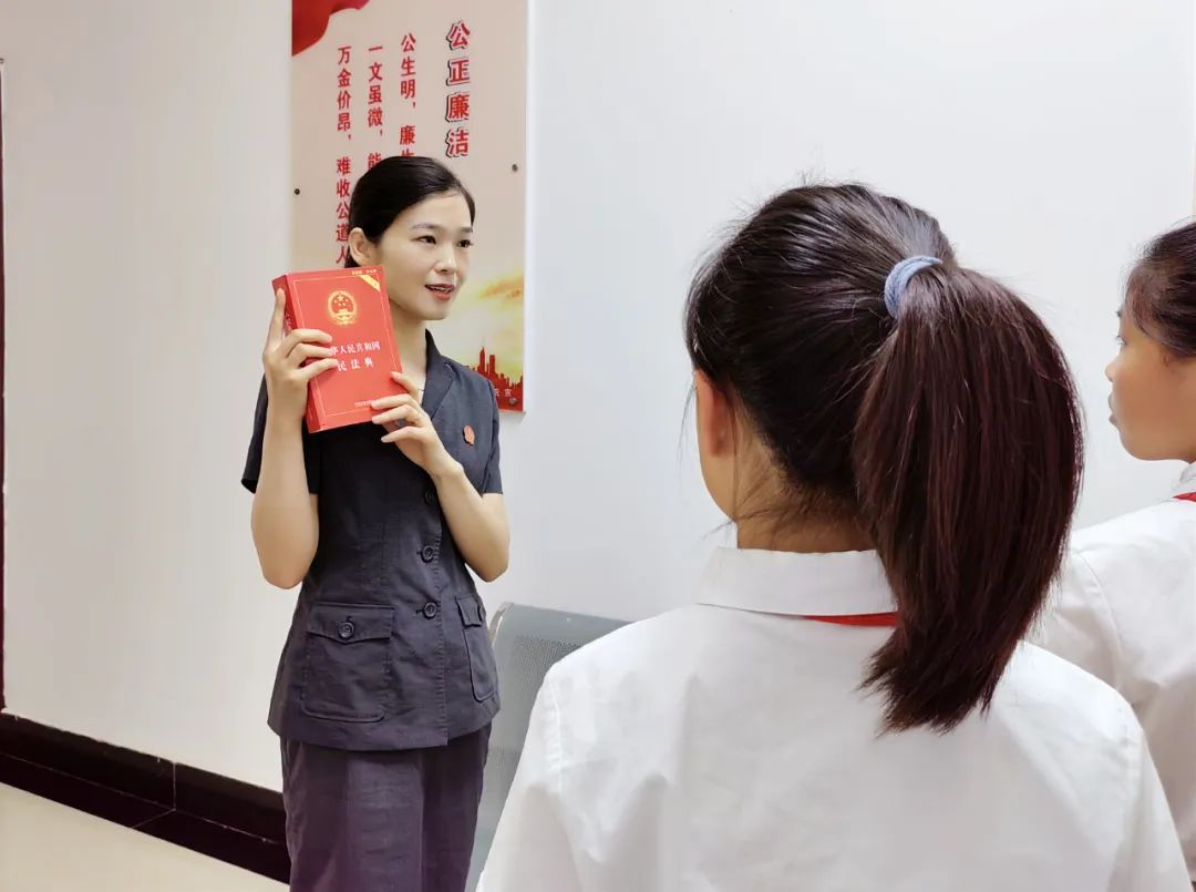 ▲鄭州市金水區人民法院舉辦開放日活動,為前來參觀的學生講解民法典。